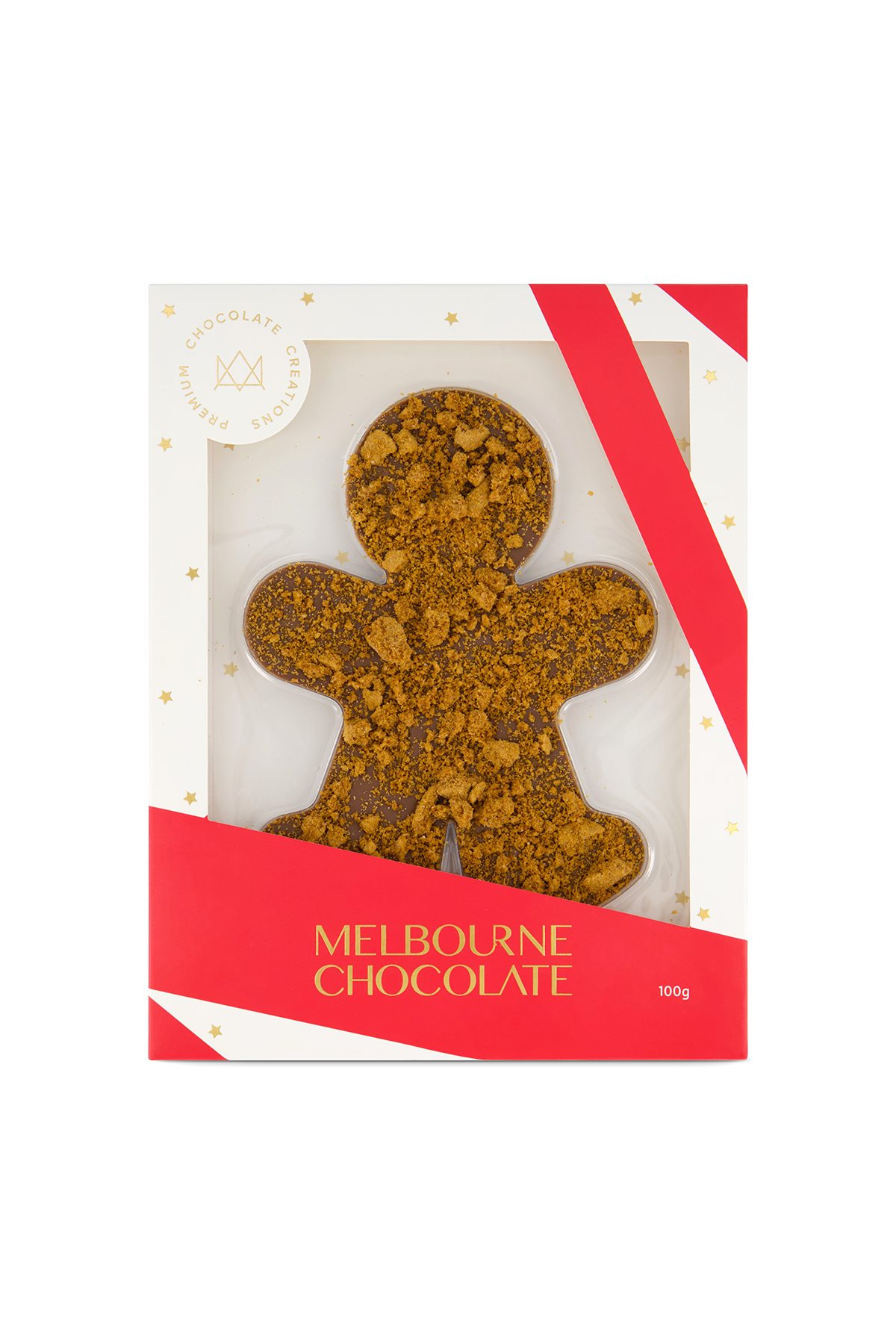 A charming twist on a festive classic. This delicious gingerbread man is made from smooth, creamy milk chocolate and sprinkled with crunchy caramel biscuit crumb for extra warmth and texture.