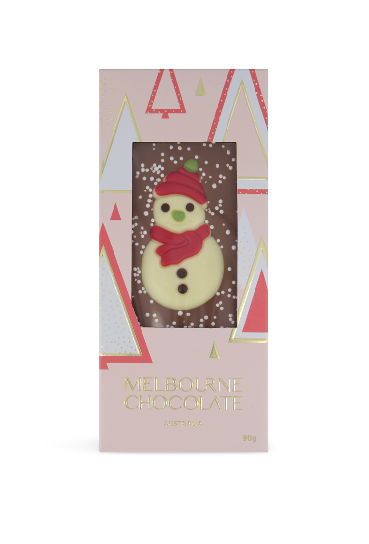 A chocolate winter wonderland. This creamy milk chocolate block is topped with a cute white chocolate snowman figurine, adding a touch of festive charm to every bite. Smooth, sweet, and irresistibly cheerful, it’s the perfect treat for gifting, sharing, or enjoying as you soak up the Christmas magic.
